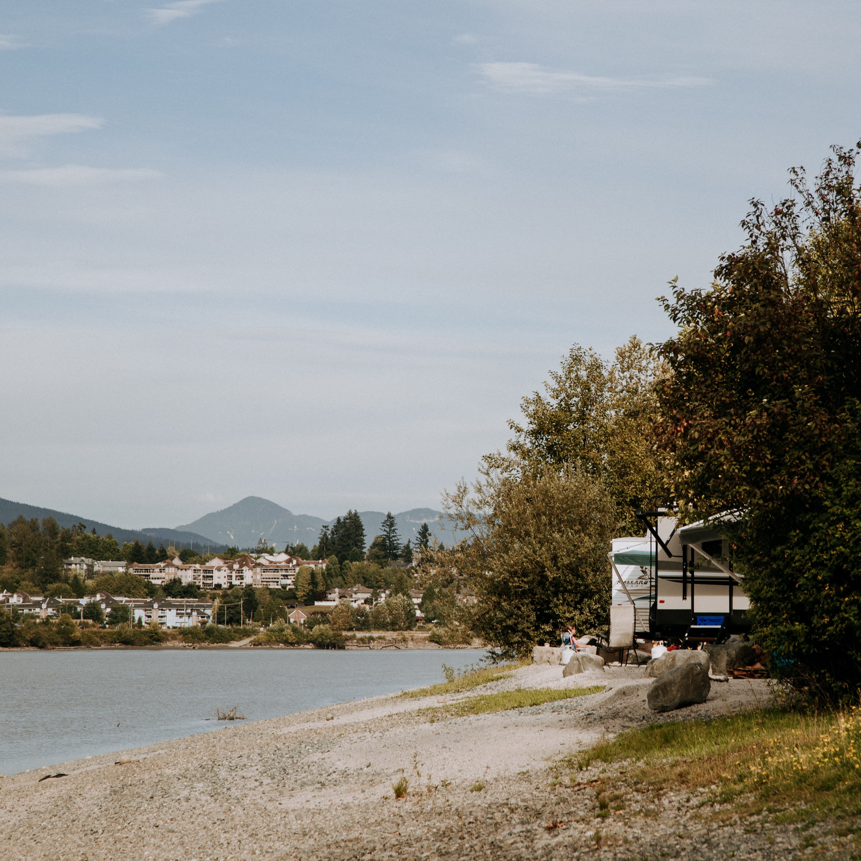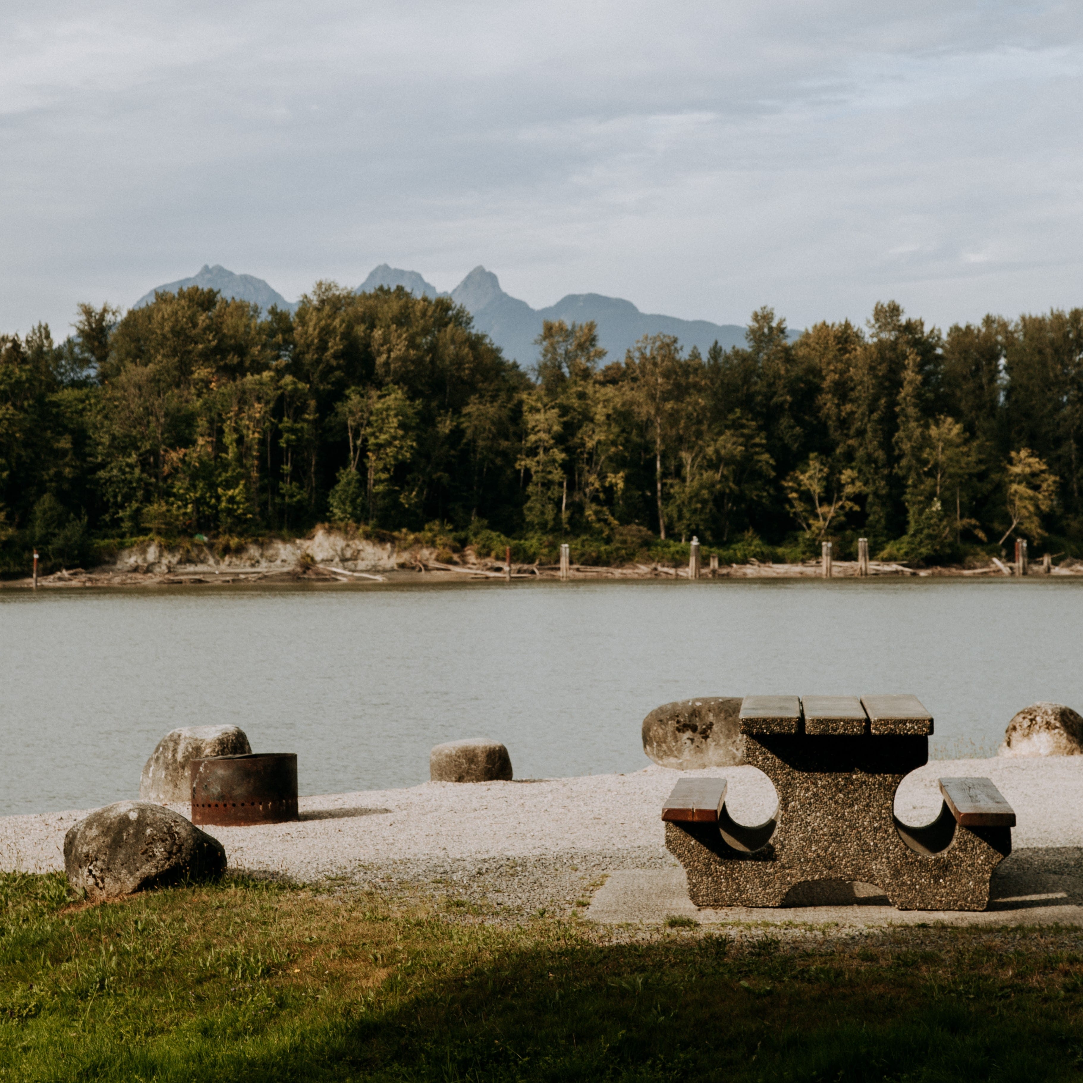 Located within Derby Reach Regional Park, Edgewater Bar Campground offers riverside camping along the Fraser River from March 1 to October 31. The campground features 38 reservable sites, each with a gravel pad, picnic table, and fire pit, and is set beside scenic park trails with views toward the Coast Mountain Range.